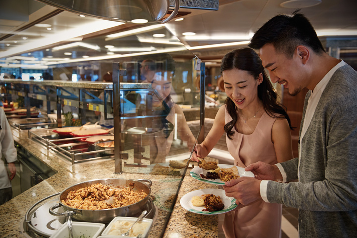 International Café: Open 24 hours a day, the International Café, located in the Piazza, is the place for an ever-changing array of small bite meals, treats and gourmet beverages. Grab a freshly baked croissant to start your day, snack on pies and quiche or choose from a wide variety of salads and sandwiches at lunchtime, and indulge in decadent desserts in the evening. Coffee and tea fans will love the New Grounds Crafted Coffee menu featuring a variety of specialty espresso-based drinks made from a custom blend of coffee beans, as well as iced tea fusions.