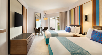 Rooms feature a pool view and a private balcony or terrace. Additional amenities include a mini-bar refreshed daily with soft drinks, bottled water and beer as well as an in-room safe, hair dryer, direct dial telephone and satellite TV.