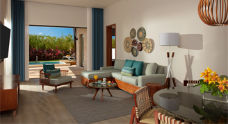 This room offers a living area with a sofa and access to a furnished terrace with a pool view. The room includes a separate bathroom and private area with sliding doors offering a full-length mirror, beauty station, double vanities and ample closet area.