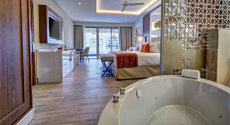 Suites feature a resort or pool view, a sliding door to separate the main guestroom for more privacy, a double sofa bed, in-suite Whirlpool soaker tub and a private balcony or terrace.