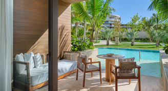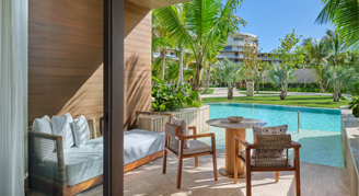 Rooms feature a swim-up pool, a living/sitting area, and may feature a balcony or terrace.