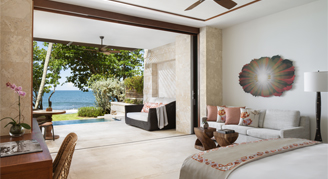 • Guest rooms feature oceanfront views, butler service, an indoor/outdoor shower, 42" LCD TV, international cable, an iPad/ipod dock, a multi-line telephone with voicemail, twice-daily housekeeping with evening turndown service, complimentary bottled water, a marble bathroom with a separate tub and shower, a lighted makeup mirror, robes and slippers, and a walk-in closet. Rooms are located in the West and East Beach areas. Room amenities and views are similar; however the East Beach is not recommended for swimming.
