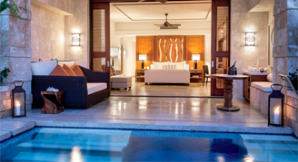 Rooms are located on the top level and feature a king bed and sofa bed. Additional amenities include a private plunge pool, deep soaking tub, spacious indoor and outdoor shower, and a private balcony.