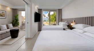 Rooms feature an ocean-view, living area with a pull-out sofa, a private balcony, a kitchenette, and a bathroom with a separate shower and tub.