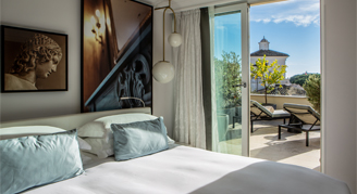 • With a calming color scheme of white, soft turquoise and gold, these completely renovated rooms are an ideal space to come back to and relax after experiencing the lavish historical art and architecture of Rome. Blending elegance and comfort, the rooms include Italian inspired contemporary art, complimentary Wi-Fi, an espresso machine, and white marble bathrooms with Hermès products.