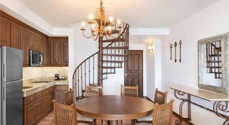 Suites feature a split-level style, spiral staircase and a partial-ocean view or an ocean view. Additional amenities include a separate living and dining area, a kitchenette, and three bathrooms.