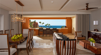 Suites are in the Acuario 1 building and feature an ocean view. Amenities include a spacious living area and dining area, and large bathroom with rain shower and walk-in closet.