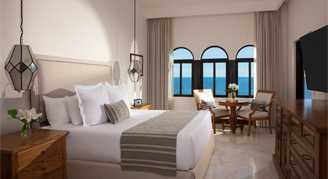 Suites are in the Hacienda building and feature an ocean view. Amenities include a spacious living area and large bathroom with double sink, rain shower and walk-in closet.