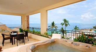 Additional amenities include three bedrooms, each with a king bed, 3.5 bathrooms (three with a whirlpool tub), floor-to-ceiling sliding glass doors in all living areas, a kitchen, a living and dining area, a washer and dryer, a wraparound terrace featuring a panoramic view of Banderas Bay, a Jacuzzi, an outdoor living and dining space, and butler service.