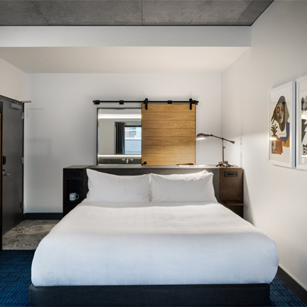 Cherry Creek loft living is at your fingertips in this spacious suite designed with an elevated bedroom found up a short flight of stairs. An artful urban enclave infusing the best of Colorado’s atmospheric charm, natural elements and an open living space, is a space ideal for business, pleasure and everything in between. Easily find a spot for your coffee, plugs for your laptop, plenty of natural light and 100% cotton sheets.