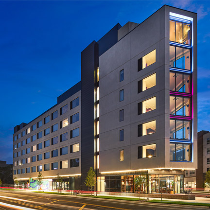 The Maven Hotel at Dairy Block is a boutique hotel in downtown Denver's LoDo neighborhood. Known for its unique, handcrafted hospitality and its location within the vibrant Dairy Block micro-district, it offers easy access to shopping, dining and entertainment. The hotel features modern, loft-style rooms, on-site dining options like Kachina Cantina and Poka Lola Social Club, and artful touches offering a connection to the local community.