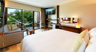 Additional amenities include direct access to a pool and an in-room Jacuzzi.