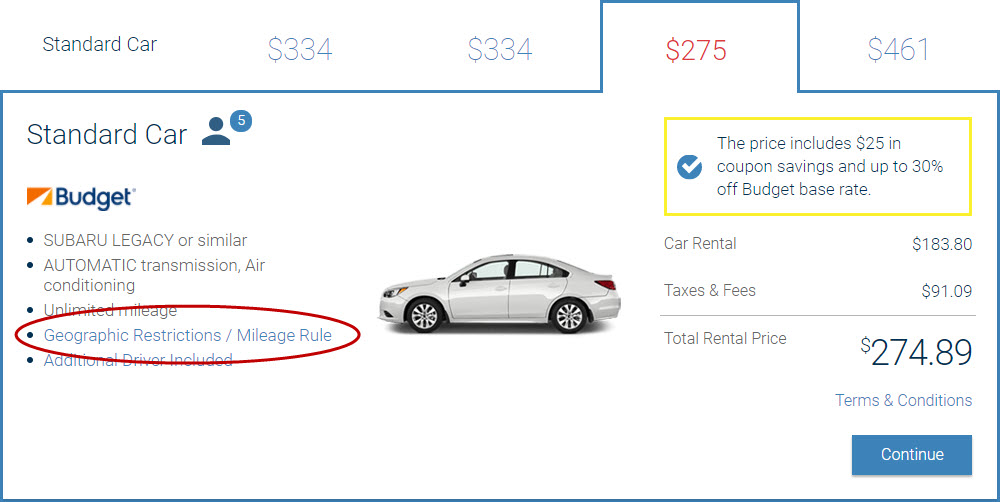 Costco Travel ensures the best value for every rental car. If, for example, a “Free Single Upgrade” coupon is selected, then a five-day rental period is specified, another coupon will override the upgrade if the price is lower per car category.