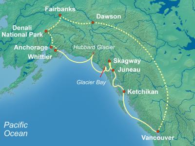 Embark on an ocean cruise along Alaska's rugged shoreline, calling on Alaska's unique coastal towns. On popular "Glacier Days," encounter glaciers up close, and learn about Alaska's ecosystem from onboard wildlife experts. Cruise to Alaska's charming coastal ports. Spend 2 nights at Denali National Park & Preserve, a spectacular 6-million-acre wilderness.