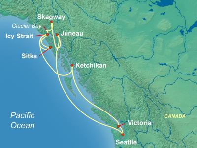 Sail round-trip from Seattle to Alaska for 10 days, including an unforgettable day spent cruising by the Hubbard Glacier. Just outside of Juneau is where you'll find Mendenhall Glacier. Walk the nature trails and explore the Visitor Center with its view of the Juneau Ice Field. Juneau also offers excellent shops and restaurants, including the iconic Red Dog Saloon. Pan for gold, feast at a salmon bake, and visit a musher camp in Skagway. This town is easy to explore on foot, but the White Pass Railway will give you a good look at Alaska's picturesque interior. In Icy Strait Point, you'll find the largest Native Tlingit village in the state. Since every shop here is Native owned, this is the place for authentic goods and handicrafts.