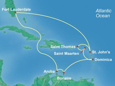 Depart from Fort Lauderdale and escape to the enchanting islands of the Southern Caribbean. Your journey begins in the sun-drenched paradise of Aruba, followed by the pristine shores and coral reefs of Bonaire. Discover the lush rainforests and waterfalls of Dominica, then explore the dual-nation charm of Saint Maarten. Continue to Saint Thomas, where breathtaking views and world-class shopping await, and finish your voyage in St. John's, Antigua. This unforgettable cruise blends natural beauty, culture, and adventure in every port.
