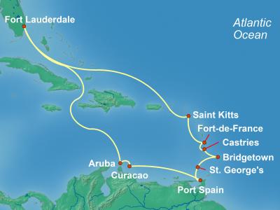 Set sail from Fort Lauderdale on a stunning 10-day cruise through some of the Caribbean's most beautiful islands. Enjoy a blend of pristine beaches, vibrant cultures and thrilling adventures as you explore Saint Kitts, Fort-de-France, Castries, Bridgetown. St. George's, Port Spain, Curacao and Aruba.