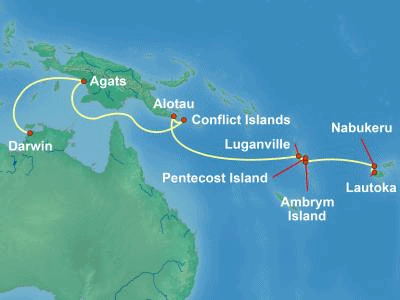 Fiji's islands are often grouped into different regions, based on both geographical isolation from other groups, but also cultural similarities between islands. The volcanic island of Ambrym, one of Vanuatu's outer islands, is spectacular. With the twin volcanoes of Benbow and Marum rising steeply from the azure waters, and a 12 km caldera to explore , the eruption in year AD50 that formed this caldera was one of the biggest in recent geological history. This idyllic archipelago of 21 coral atolls off the coast of New Guinea was named after the British ship HMS Conflict by its discoverer, a most patriotic captain. Explore the King George Falls, the two highest twin waterfalls in Australia at 80m/250ft in height. The river was named in 1911 by explorer Charles Conigrave after a privately funded expedition in the area. The river is named in honor of King George V.