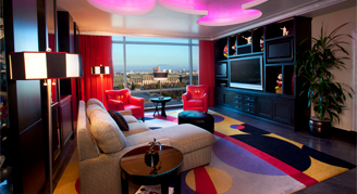 The Mickey Mouse Penthouse Suite includes Mickey Mouse themed decor and consists of a master bedroom with one king bed and ensuite bathroom featuring dual vanity sinks, a deep soaking tub and separate shower; second bedroom with one double bed; second bathroom with shower; and separate living room featuring a seating area with a queen-size pull-out sofa, dining table with seating for six, and a wet bar with a sink, mini-fridge and Keurig coffee maker. Additional Amenities include nightly turndown service and exclusive access to The High Key Club.