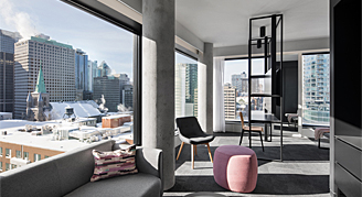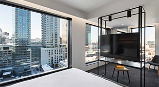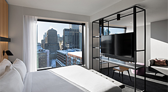 Corner suites offer extra space and panoramic views of the city. Amenities include a rain shower, mini-fridge, complimentary Wi-Fi and a 55-inch HD TV.
