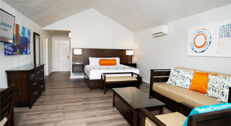 Rooms are single-story duplex villas with oceanfront views in classic Caribbean-styled architecture. A combined living and sleeping area comfortably accommodates up to four people.