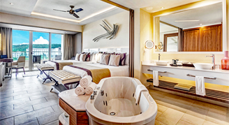Suites feature an ocean view, separate living space, bathroom Jacuzzi tub and have a private balcony or terrace. Some rooms may consist of a One-Bedroom Suite with adjacent Junior Suite to create a Two-Bedroom Suite.