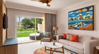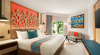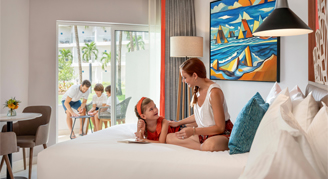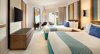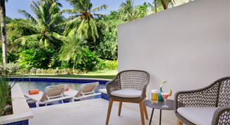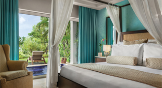 Rooms feature a garden view and swim-out pool access. (Must be 13+). Additional amenities include a mini-bar refreshed daily with soft drinks, bottled water and beer as well as an in-room safe, hair dryer, direct dial telephone, and satellite TV.