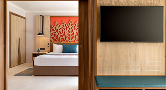 Rooms feature a partial-ocean view and a private balcony or terrace. Additional amenities include a mini-bar refreshed daily with soft drinks, bottled water and beer as well as an in-room safe, hair dryer, direct dial telephone, and satellite TV.
