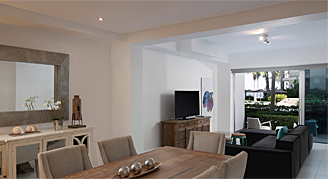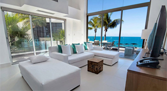 This spacious, bi-level suite features 16-foot ceilings, two bedrooms and two king beds (one in each room), two private bathrooms and a wardrobe, a fully equipped kitchen, washer and dryer, and own private terrace. These luxurious units offer floor-to-ceiling windows with sweeping views of the resort, pools and ocean.