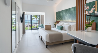 Room features an ocean-view. Complete with one king bed, premium amenities, a master bathroom, large living/dining area with sofa bed, an oversized terrace with sun lounger, stunning ocean views, and Preferred Club access.