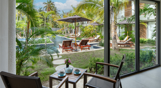 In addition to the standard amenities, the Deluxe room offers access to a furnished terrace with garden views. The bathroom includes a rain shower, a W/C and a separate, private area with sliding doors offering a full-length mirror, beauty station, double vanities and ample closet area.