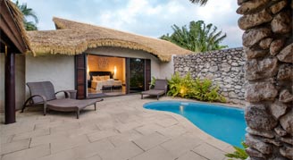 Villas are located directly on the beach and feature an ocean view. Additional amenities include a private pool, and a large outdoor deck with lounge furniture.