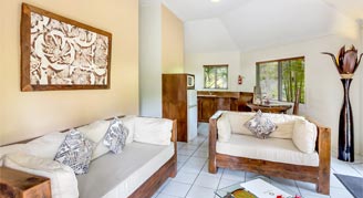 Villas are located in the garden near the main swimming pool. Amenities include a private deck with outdoor lounge furniture.