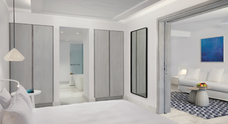 Located on the ground floor with furnished terraces and a partial-sea view. These spacious rooms have an open plan bathroom with a free-standing designer bathtub, and a walk-in shower with a rain showerhead.