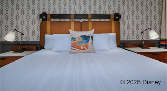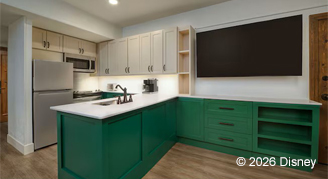 Located in Boulder Ridge Lodge, Resort-View One-Bedroom Villas feature a view of Pool, Woodlands, Courtyard, or Disney's Wilderness Lodge Resort Hotel. Amenities include one king bed and one queen-size pull-down bed or one king bed and one queen-size sleeper sofa. Includes a full kitchen, living and dining areas, washer and dryer, and a porch or balcony.