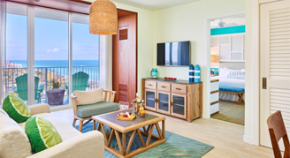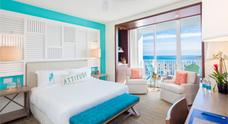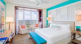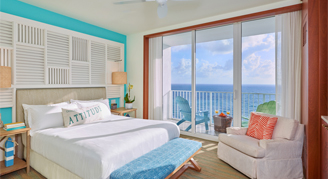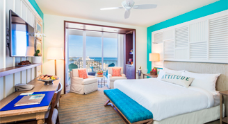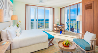 The resort’s 349 guest rooms are a blend of coastal casual design and stylish comfort. Influenced by the colors of the sea, the sand and the sky, features include bedding with crisp all-white linens, and teak-finished furnishings accompanied by subtle maritime accents. Spacious walk-in rain showers with sea glass-colored tile, teak vanities topped with vessel sinks and tropical bath amenities create a serene bath experience.