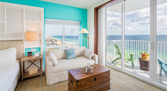 Enjoy partial-ocean views of the Atlantic Ocean from the balcony of this relaxing retreat. This one-bedroom suite provides a convenient separate living and sleeping area to enhance your stay. Contemporary furnishings with a soothing sand, sea and sky color palette reflect a coastal-luxe atmosphere. A king bed with luxurious, all-white linens and premium bedding creates the perfect setting for further relaxation after another day in paradise. A large vanity and over-sized shower add functionality to a refreshing bathroom, which is highlighted with sea glass-inspired tile work.