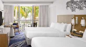 Fresh and comfortable, this nautical-styled room offers two double beds topped with crisp white linens to drift off to sleep. Featuring refined furnishings with coastal décor and hues complementing the outdoor views. This spacious room provides a lounge space, conveniently located USB charging ports and a 55-inch HDTV. Relax and renew in a rain shower bath accessorized with Crabtree & Evelyn® amenities. Thoughtful touches of ocean-inspired art and plush bedding create a welcoming stay in alluring comfort.