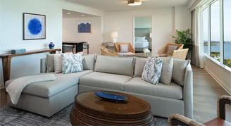Admire panoramic bay views from this spacious suite features one king bed in a separate bedroom, a separate living room with kitchenette and dining table, and bathroom with a large vanity and walk-in shower.