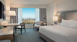 Rest comfortably in this spacious room featuring a king bed, abundant natural light, picturesque city views, a mini-fridge and a modern bathroom with a glass-enclosed shower.