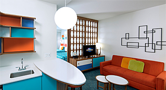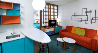 Family Suites offer a sliding privacy partition between the bedroom and living space, plus a kitchenette with a mini-fridge, microwave and small sink.