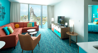 Suites feature views of Universal's Volcano Bay Water Theme Park. Enjoy views of the mighty Krakatau™ volcano and the tropical landscape. Amenities include a room with one queen bed and a second room with two double beds, a living room with full-size sofa bed, three flat-screen TVs, a kitchenette with a mini-fridge, microwave and small sink.