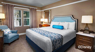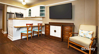 These studios feature views of Disney’s Beach Club Resort, pool, woods or courtyard; and a private porch or balcony. Amenities include a kitchenette with a small fridge, microwave and coffee maker, a full-size pull-out sofa bed and a single-size pull-down bed.