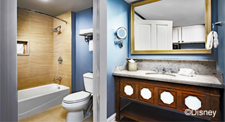 These villas feature views of Disney’s Beach Club Resort, pool, woods or courtyard; and a private porch or balcony. Amenities include a full kitchen, a split bathroom with two sink areas, and a queen-size pull-out sofa bed.