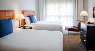 Suites feature a view of the garden, pool or the parking lot. Amenities include a spacious floorplan, two bedrooms, a living area, one king bed in the master bedroom, two full-size beds in the second bedroom, a queen-size sofa bed in the living room, and two bathrooms with a soaking tub.