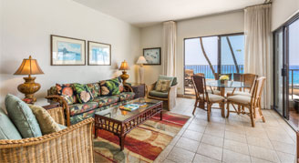 Suites feature a distant and angled ocean view from the lanai. Additional amenities include one separate bedroom and a spacious living area.