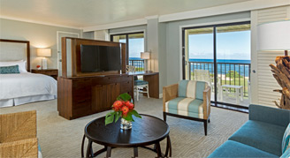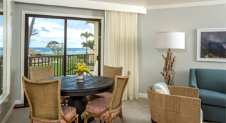 Suites feature a distant view of the ocean. Additional amenities include a private sitting area and wet bar.
