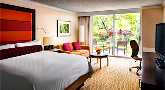 Rooms feature views of landscaped gardens and tropical flowers.