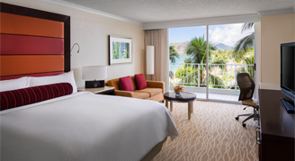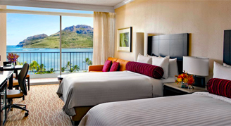 Guest rooms feature deluxe bedding including down comforters, fluffy pillows and designer duvets, as well as his-and-her robes and slippers, and in-room Kauai coffee service.