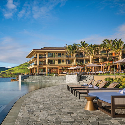 Hale rooms are located on the ground floor, perched upon a hillside and feature views of the surrounding resort gardens. Additional amenities include a soaking tub, oversized lanai and a rain shower.
